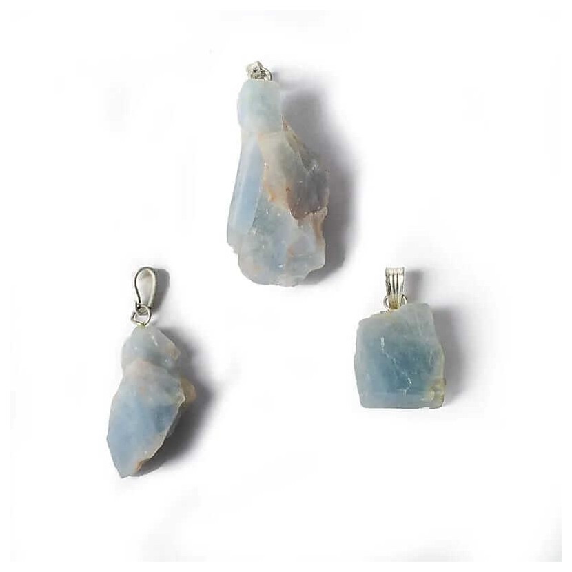 Surowy niebieski kalcyt, noszony jako wisiorek, wspiera spokój wewnętrzny, łagodzi stres i sprzyja jasnej komunikacji.
